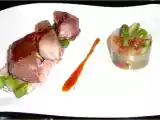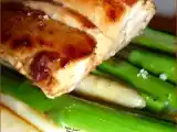 Ingrédients: un joli morceau de longe de Thon Albacore (sans arêtes), un filet de Sauce Soja, 6 belles Asperges Vertes, 6 fines tranches de Lard, 10 pointes...