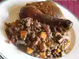 Ingrédients: 1 pintade 400 gr d'échine de porc 400 gr d'échalotes 2 c. à soupe de vinaigre balsamique 10 cl de porto blanc 15 cl d'eau 1 cube de bouillon beurre...