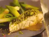 Ingrédients: 600 g de filet de turbot en une seule pièce épaisse avec l'arrête 180 g de pistaches vertes mondées non salées 4 petits poireaux 50 g de beurre 1...