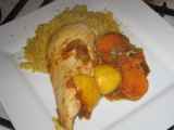 Ingrédients: 1 patate douce 1 filet de poulet Sel 2 c. à soupe d'huile d'olive Herbes aromatiques Feuilles de roquette