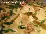Ingrédients: 250 g de ravioli frais farcis au boeuf ou au jambon cru 30 g de beurre + un peu pour le plat 1 gousse d'ail écrasée 1 petit oignon finement haché...