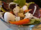 Ingrédients: 1/2 salade verte, feuilles de chêne, batavia, mesclun... 100 g environ de poivrons grillés (en bocal), finement émincés 100 g de mozzarella,...