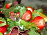 Ingrédients: 100g de mesclun 10 tranches de filet de canard fumé 1 tomate coupée en dés 1 orange coupée en quartiers 6 fraises coupées en deux 1/2 oignon...