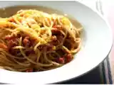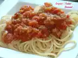 Ingrédients: 500 gr de spaghetti 750 gr de tomates bien mûres 300 gr de viande de boeuf haché 150 gr de lard fumé découronnée et haché 2 cuillères à soupe...