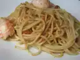 Ingrédients: 300 g de spaghetti (blé complet,sarrasin et épeautre) 450 de crevettes crues 2 gousses d'ail 2 cuillères à soupe de tamari (sauce de soja...