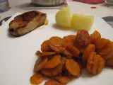 Ingrédients: 24 noix de saint-Jacques 160 g de chorizo de 2-3 mm s'épaisseur 4 carottes 70 gr de beurre à 41%MG 4 cuillères à café d'huile d'olive Sel poivre