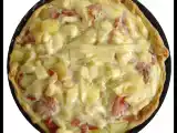 Ingrédients: Une pâte brisée 600 g de pommes de terre 2 oignons 2 tranches de jambon blanc 20 g de beurre 80 g de gouda 2 oeufs 20 cl de crème liquide sel et...