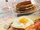 Ingrédients: 8 tranches de poitrine séchée nature ou fumée 8 pancakes 4 oeufs extra-frais plein air 1 petite noix de beurre 1 cuillère à soupe d'huile de...