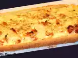 Ingrédients: 500 gr de farine 1 c. à café de sel 10 gr de levure de boulanger fraîche 15 gr d'huile d'olive 31 cl d'eau 1 oignon 200 gr d'allumettes de lardons...