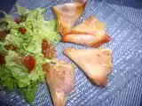Ingrédients: 4 tranches de saumon fumé 2 feuilles de brick 4 tranches de fromage de chèvre en bûchette 3 cuillères à soupe d'huile de noix 1 tomate 1 cuillère...