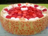 Ingrédients: Génoise : 4 oeufs 125 g de sucre (dont un sachet de sucre vanillé) 125 g de farine 1/2 sachet de levure chimique Crème à la pêche : 3 feuilles de...