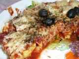 Ingrédients: 3 courgettes un sachet d'emmental râpé de la feta des olives noires de l'ail en poudre du sel du poivre de l'origan de la sauce tomate concentrée...