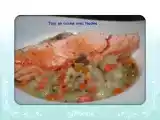 Ingrédients: 4 filets de saumon 200 gr de petites crevettes roses ou grises 800 gr de petits légumes 200 gr d'oignons grelots 2 cubes de fumet de poisson...