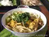 Ingrédients: 2 escalopes de poulet 1 oignon 1 gousse d'ail 70 g de vermicelles de riz 1 cuillère à soupe d'huile de sésame 4 gousses de cardamome écrasées 2...