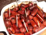 Ingrédients: 400 gr de saucisse 40 cl de sauce tomate 4 feuilles de laurier 8 cl de vin rouge 1 oignon (petit) Huile d'olive Poivre Sel