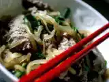 Ingrédients: 4 oignons 500 g de pousses d'épinard (ou d'épinards frais) 500 g de boeuf coupé en fines lanières 20 cl de vin blanc 10 cl d'eau 2 cuillères à...
