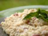Ingrédients: 4 échalottes 25ml d'huile d'olive 750ml de bouillon de volaille 100g de lardons 250g de riz arborio 100ml de crème liquide 100g de gorgonzola