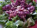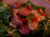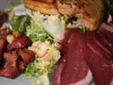 Ingrédients: Pour 2 belles assiettes repas 250 gr gésiers de poulet confits 3 pommes de terre 1 tomate quelques feuilles de salade