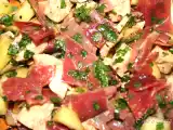 Ingrédients: 1 mangue 1/4 d'oignon rouge 6 crevettes roses (cuites, décortiquées) Basilic 2 citrons verts Huile d'olive Sel Poivre