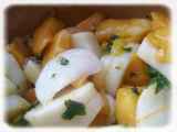 Ingrédients: 200 g d'escalopes de poulet 1 kg de pommes de terre 1 poivron rouge 1 mangue (bien mûre) 1 bouquet de persil Vinaigre de cidre Huile d'olive Sel...