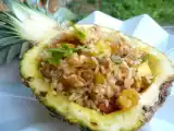 Ingrédients: 1 ananas 1 poivron vert coupés en dés 3 blancs poulet en dés 3 saucisses de Strasbourg émincées 3 échalotes hachées 2 cuillerées à soupe de nuoc...