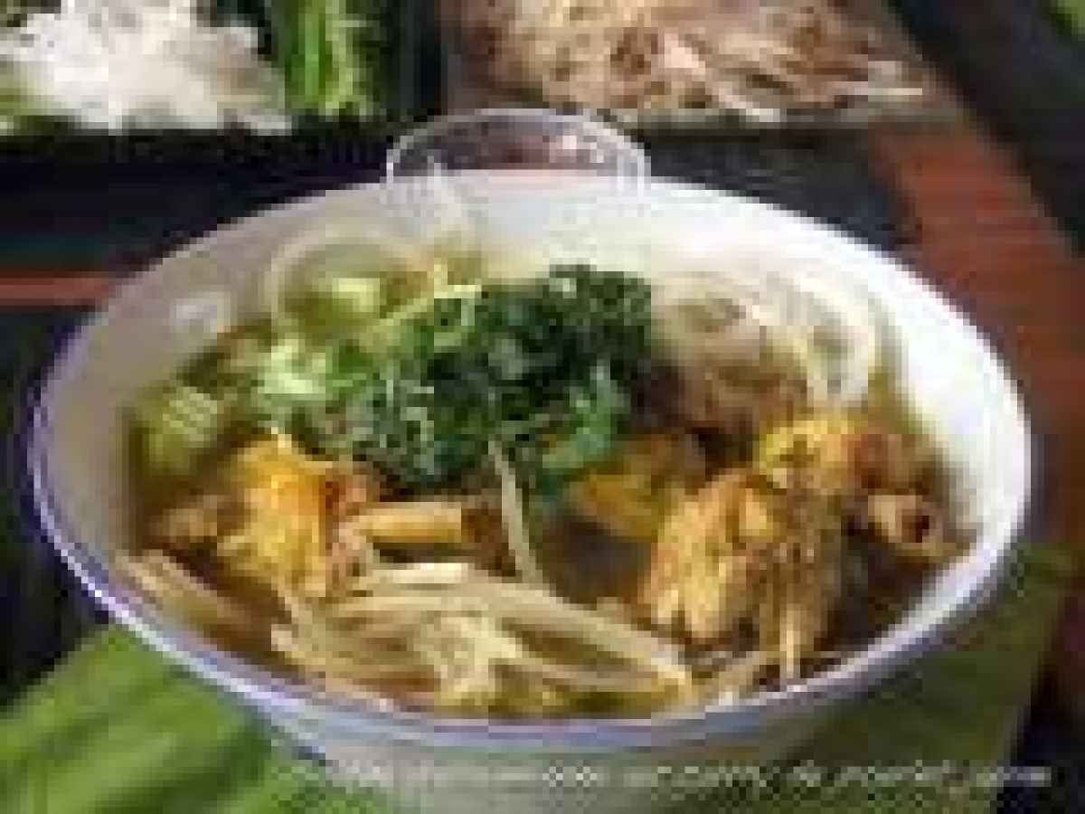Le bouillon est plus clair (ici je l'ai chargé en gras), moins gras et plus jaune Ingrédients pour 8 bolsUn gros poulet jaune fermier d'un kilo et demi (élevé au maïs)500 gr de pulpe de noix de coco déséchée (pour cette recette, éviter les boîtes de conserve de lait de coco)4 cas de poudre de curry jaune (acheter vraiment la poudre de curry thaï ou vietnamienne dans une épicerie asiatique, de façon à avoir une poudre très jaune, ni orangée ni marron, ces derniers correspondent plus à des curry indiens)1,5 cas à soupe de sucre en poudre6 ou 7 cas de sauce Nuoc Mam3 gros oignons jaunes coupés en quatre3 grosses gousse d'ail émincées5 feuilles de citronnier (Bay Kihout ou Bay Makrut)2 bâtonnets de cannelle6 pommes de terre de type Rosenwald (plus douces et sucrées), coupées en 6 morceaux2 petites tomates bien rouges et mûres (olivettes par exemple)2 cas de gros selPoivrehuile d'arachidePour le servicegermes de soja ébouillantésconcombre en lamelles une botte d'oignons blancscitron vertscoriandrecoriandre épineusementhejeunes oignonspiment séché réduit en poudre au mortierspaghettis (cuisson al dente)les feuilles plutôt jaunes et croquante d'une batavia, émincée en rubans de 5 mm de large