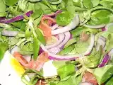 Ingrédients: 200 g de mâche 200 g de filet de truite fumée 2 oeufs 2 oignons rouges 1 cuillère à soupe de vinaigre balsamique blanc 1 cuillère à soupe de...