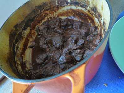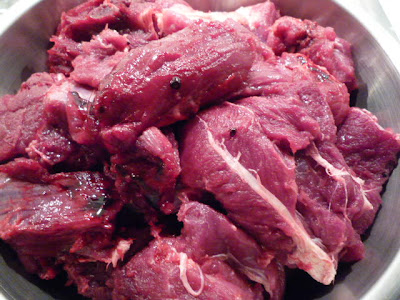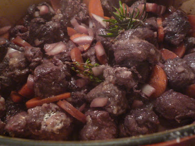 J'ai oublié la photo, mais coupez la viande en cubes et faites les mariner avec un vin rouge de bonne qualité ( j'ai pris un châteauneuf du pape), pas mal d'oignon, ail, thym, carottes, laurier, baies de genevière, girofle, poivre.